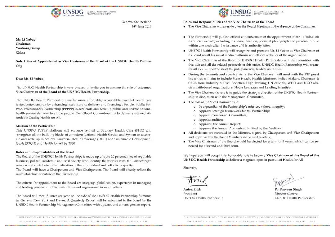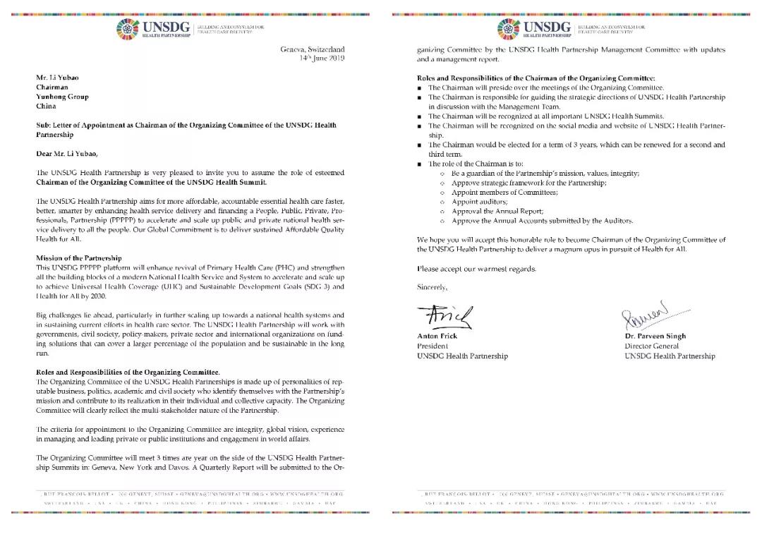 UNSDG健康夥伴關系組織委員(yuán)會(huì)主席任職信及譯文(wén)